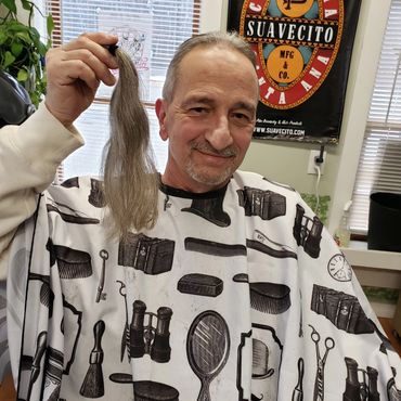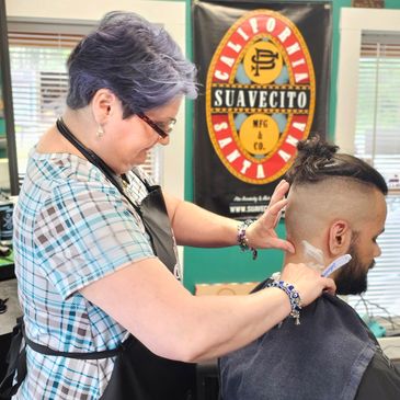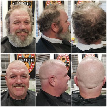 finished with straight razor on back neck includes, eye brows, ears, mustache trim.